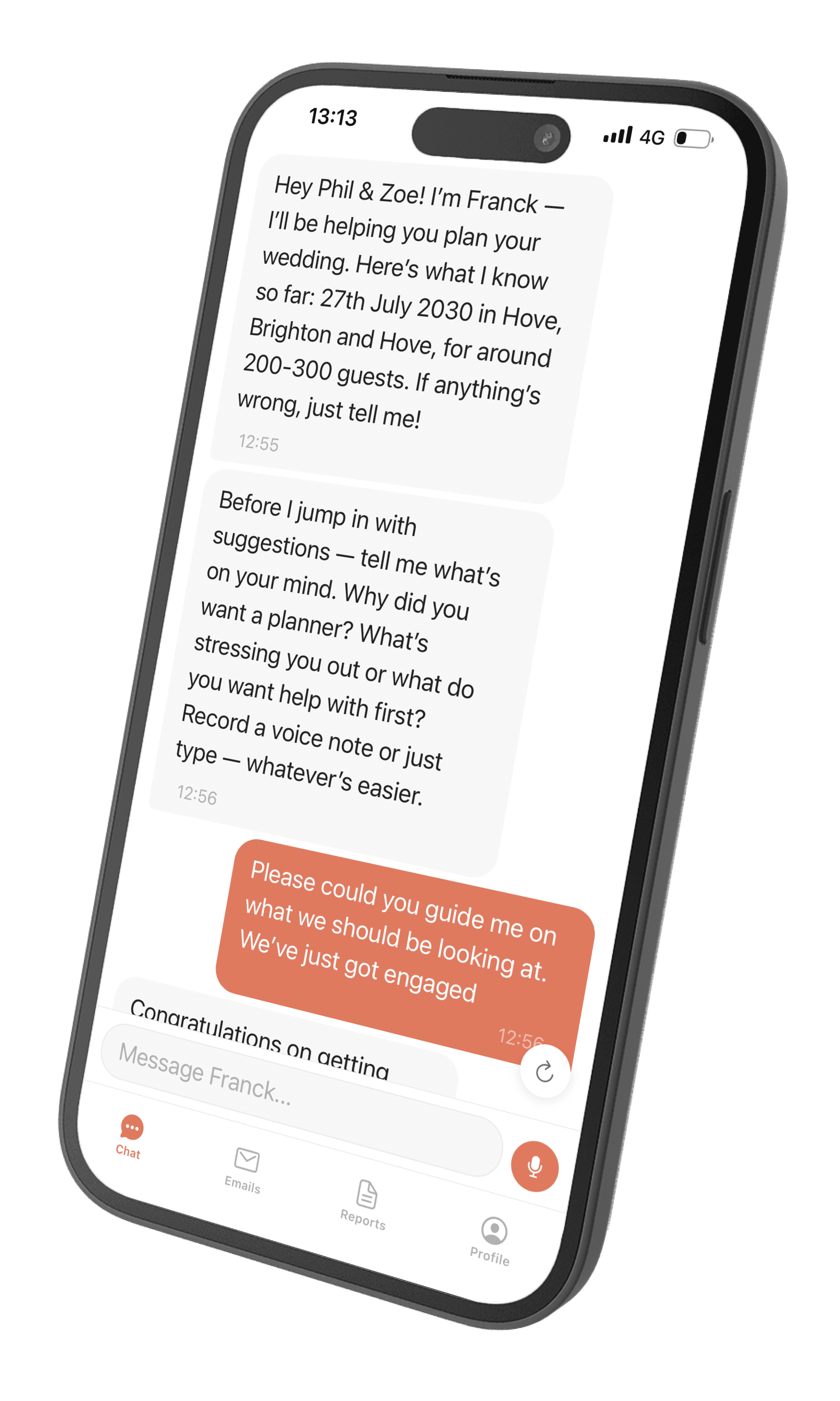 "Find me barn venues in Sussex under £5k." Franck comes back with a shortlist, pros and cons, and contact details. No more 2am doom-scrolling.